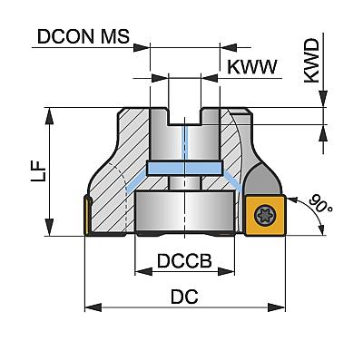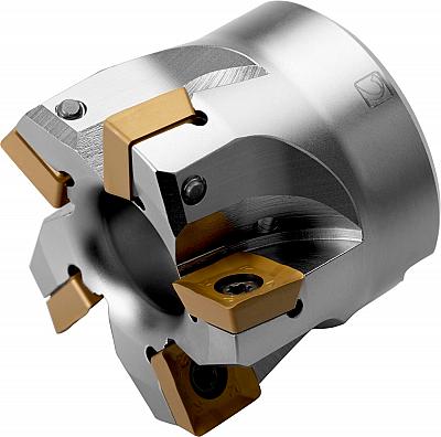 Фреза для обработки уступов с позитивно-негативной геометрией, количество зубьев 9, -SDMT 1205., односторонние пластины, диаметр фрезы от 125 мм с 90° углом в плане и 40 мм насадным хвостовиком с пазом в соответствии с DIN 8030-A’ 63 мм вылет, внутренний подвод СОЖ для неглубокого фрезерования карманов и уступов, неглубокого фрезерования пазов и плунжерного фрезерования с максимальной глубиной резания 10.0 мм.