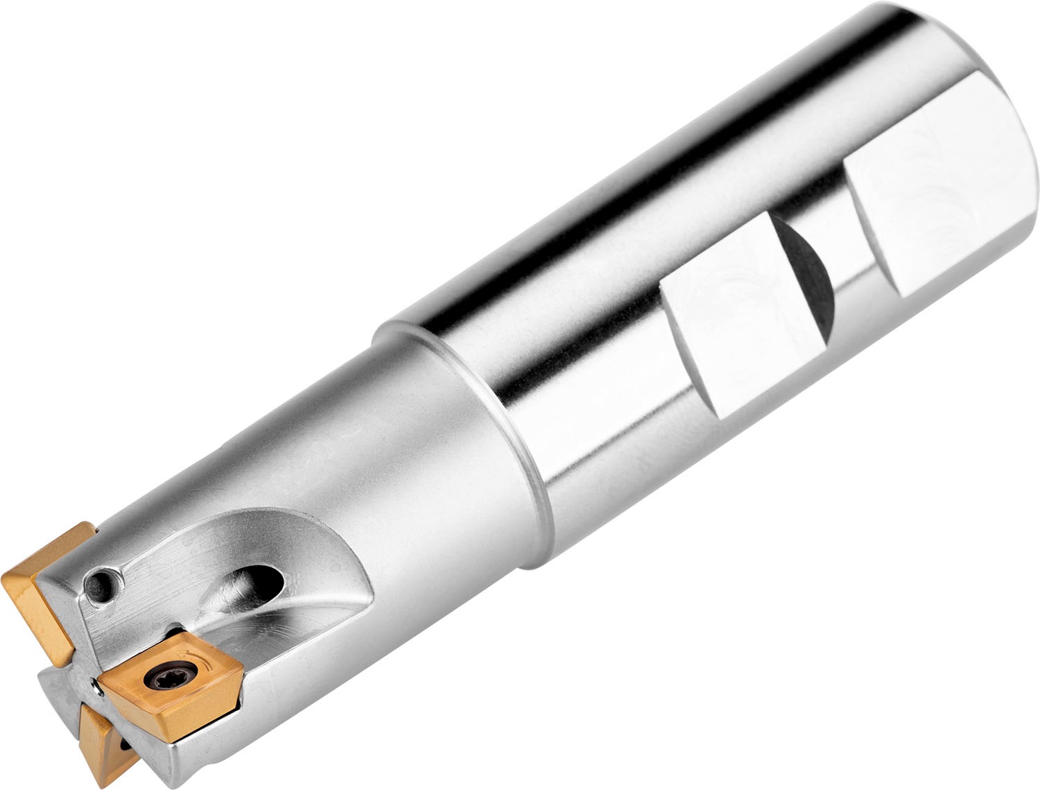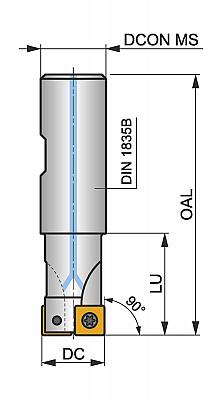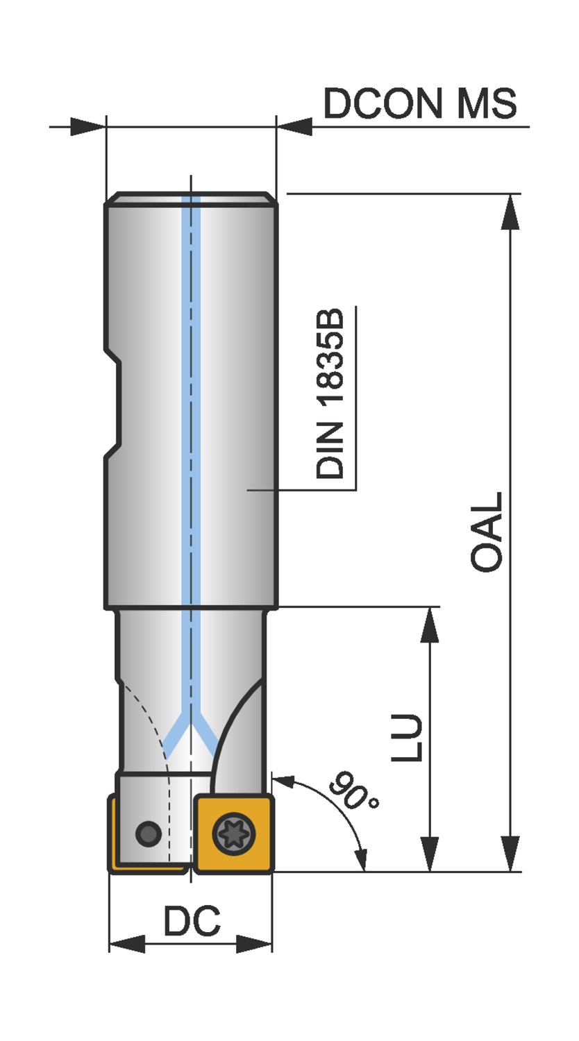 Фреза для обработки уступов с позитивно-негативной геометрией, количество зубьев 3 -SOMT 09T3.. односторонние пластины, диаметр фрезы от 25 мм с 90° углом в плане и 25 мм хвостовиком Weldon в соответствии с DIN 1835B, 98 мм общая длина, внутренний подвод СОЖ для неглубокого фрезерования карманов и уступов, неглубокого фрезерования пазов и плунжерного фрезерования с максимальной глубиной резания 8.0 мм