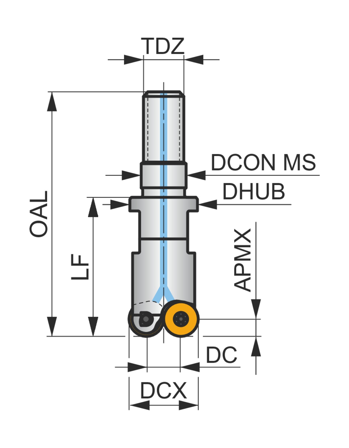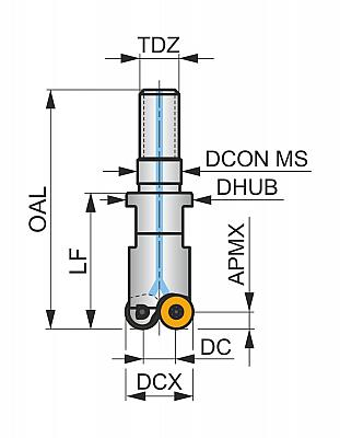 Копировальная торцевая фреза с позитивно-негативной геометрией, количество зубьев 3 -RD.. 0501MO.. односторонние пластины, диаметр фрезы от 12 мм с M6 хвостовиком с резьбой для стандартных оправок под сменные головки, 20 мм вылет, внутренний подвод СОЖ для фрезерования плоскостей, копировального фрезерования’ фрезерования под углом, фрезерования по винтовой интерполяции и прогрессивного плунжерного фрезерования с максимальной глубиной резания 1.5 мм.