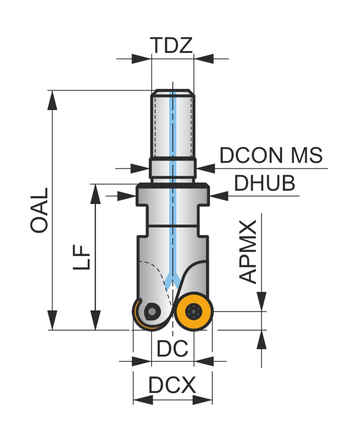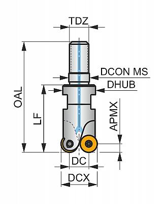 Копировальная торцевая фреза с позитивно-негативной геометрией, количество зубьев 4 -RD.. 0501MO.. односторонние пластины, диаметр фрезы от 15 мм с M8 хвостовиком с резьбой для стандартных оправок под сменные головки, 20 мм вылет, внутренний подвод СОЖ и переменный шаг зубьев для фрезерования плоскостей, копировального фрезерования, фрезерования под углом, фрезерования по винтовой интерполяции и прогрессивного плунжерного фрезерования с максимальной глубиной резания 1.5 мм.