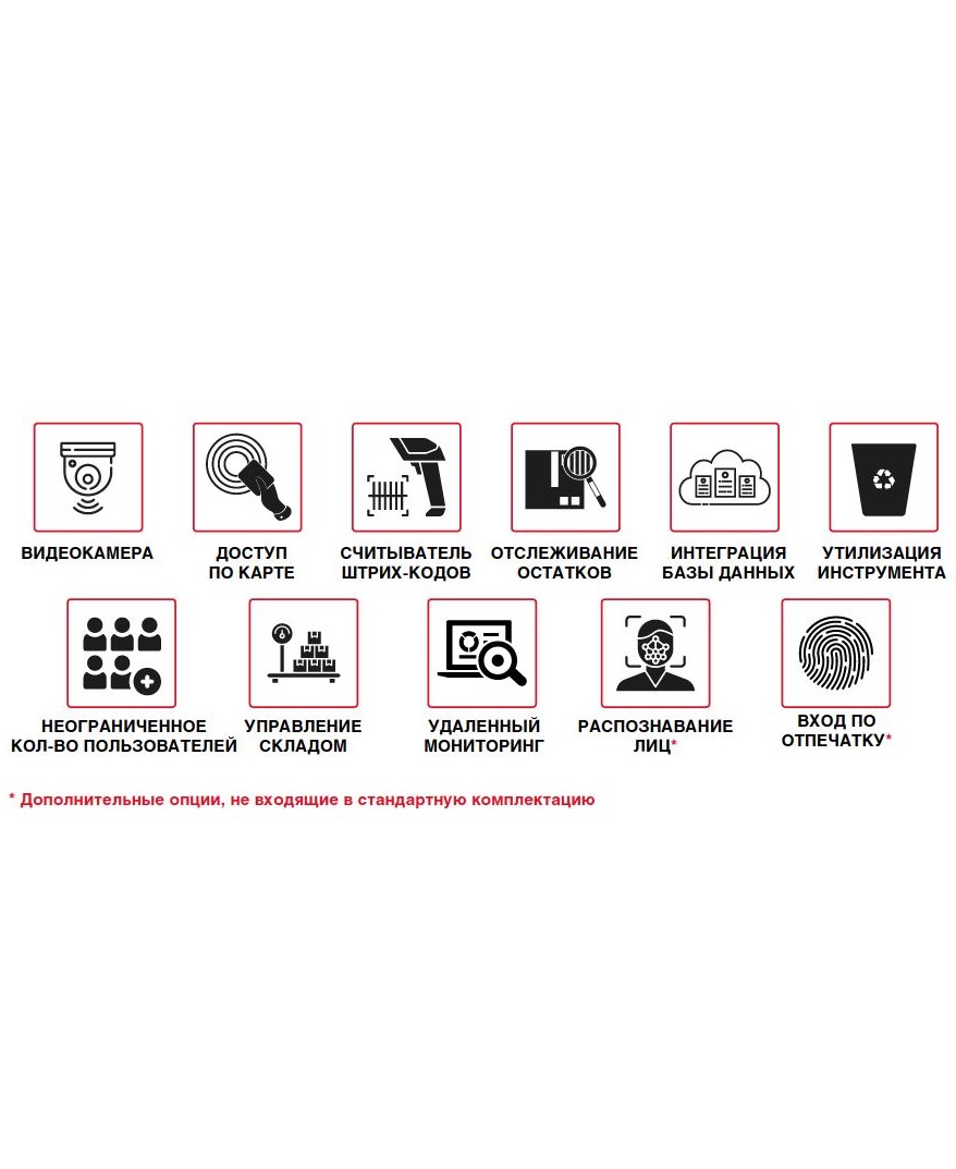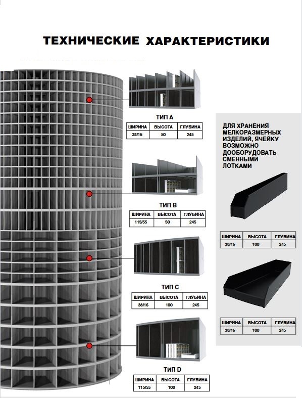 Автоматизированный шкаф содержит индивидуальные ячейки для хранения товаров. Максимальное количество ячеек – 2340. Благодаря большому количеству запираемых ячеек вы можете хранить уменьшить минимальный размер выдачи инструмента и хранить их поштучно. Размеры ячеек настраиваются индивидуально под реальные потребности вашего производства.