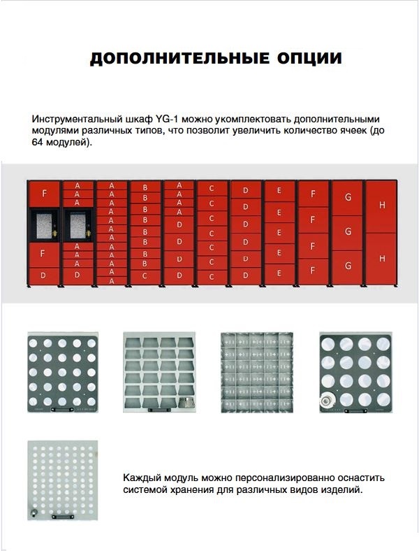 Инструментальный шкаф YG‐1 можно укомплектовать дополнительными модулями различных типов, что позволит увеличить количество ячеек (до 64 модулей).
