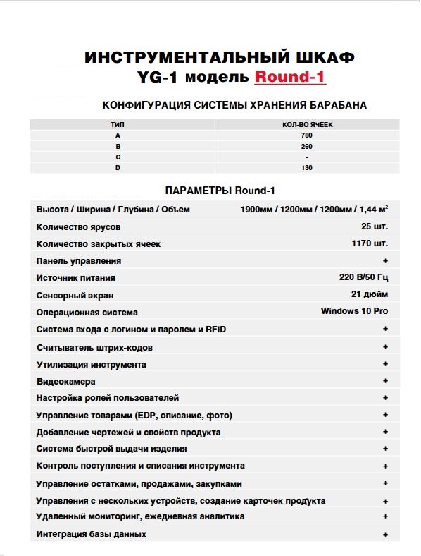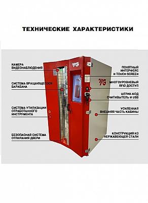 Инструментальный шкаф YG‑1 Round 1 — автоматический инструментальный шкаф барабанного типа, который функционирует круглосуточно с минимальным участием человека. Он эффективно управляет запасами и обеспечением инструмента на предприятии. Настройки шкафа позволяют создать интеллектуальную модель логистики с учетом сроков поставки, объемов потребления и частоты заказов инструмента, что оптимизирует управление складом. Аналитические отчеты помогают отслеживать отклонения в потреблении инструмента за любой период и планировать страховые складские запасы.