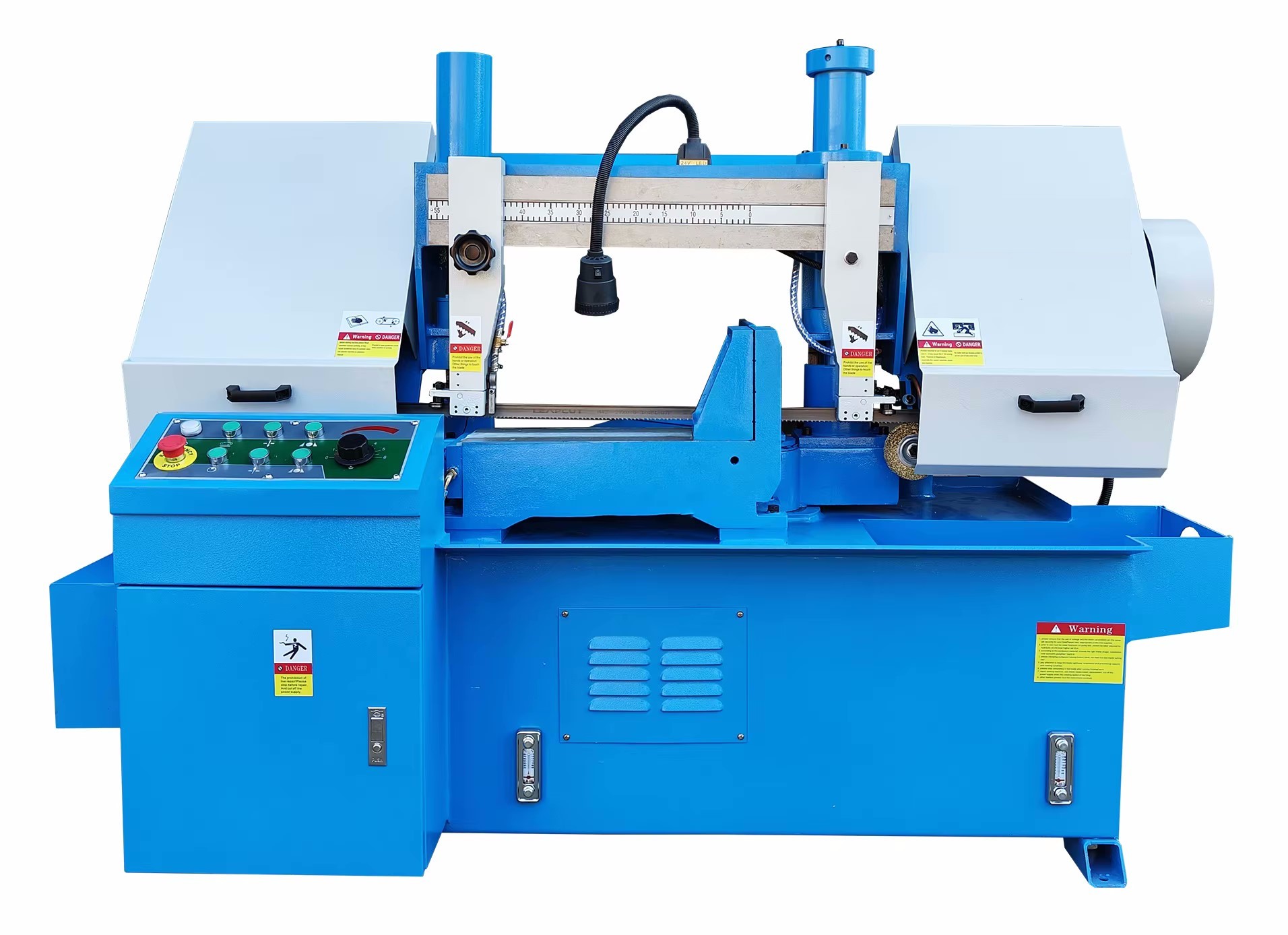 Полуавтоматический ленточнопильный станок с поворотной рамой BSG4230 используется для распила профилей, сплошных заготовок из инструментальных, нержавеющих сталей, чугуна, цветных металлов и других материалов. Область применения: средне- и крупносерийное производство различных отраслей. Пиление на станке BSG4230 осуществляется в полуавтоматическом режиме: резка производится в автоматическом режиме, а зажим заготовки выполняется гидравлическим зажимом. Конструктивной особенностью данной модели является поворотная пильная рама с регулировкой в диапазоне 0 - 60°. Движение пильной рамы и соответственно подача ленточного полотна осуществляется гидравлическим цилиндром. Скорость вращения полотна настраивается в широком диапазоне (27, 45, 69 м/мин), что позволяет максимально эффективно использовать оборудование в соответствии с профилем и обрабатываемым материалом. Ленточнопильный станок BSG4230 представляет собой портальную конструкцию на колоннах, которая имеет следующие преимущества: