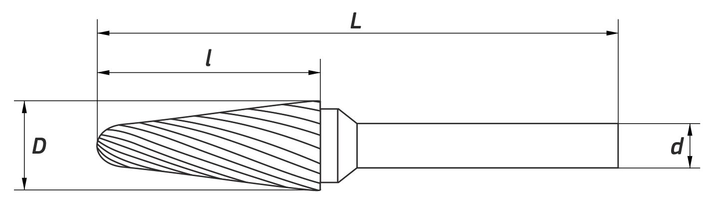 Твердосплавная бор-фреза сфероконическая Тип L. Размеры : диаметр рабочей части 19 мм, диаметр хвостовика 6 мм, длина рабочей части 38 мм, длина хвостовика 45 мм. Алмазная насечка.